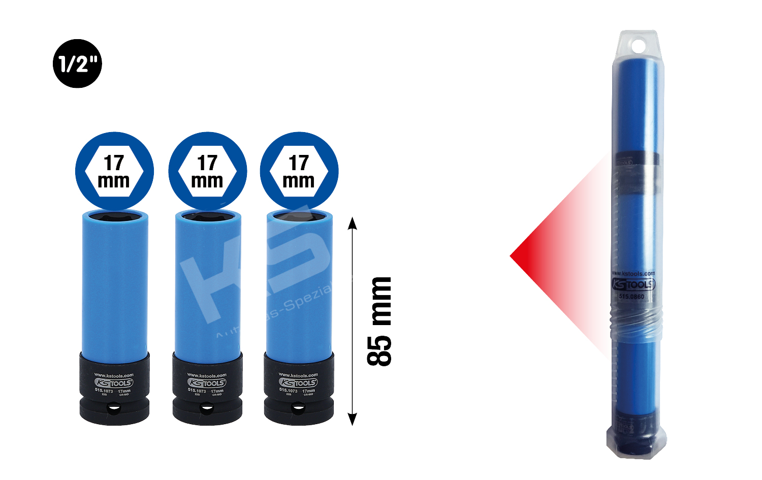 1/2″ Alu-Felgen Kraft-Stecknuss,lang,17mm 3x 515.1073 in Kunststoffrohr