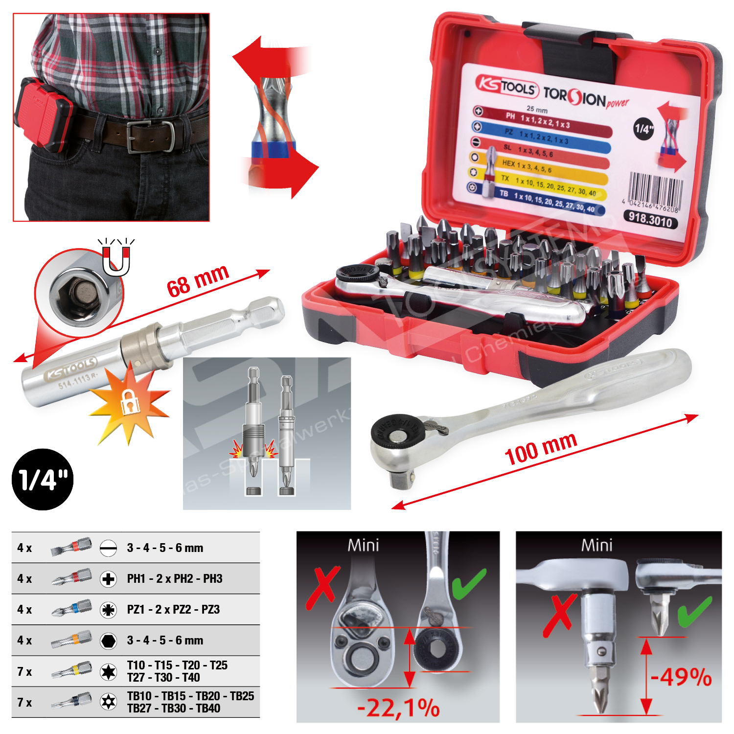 - inklusive magnetischem Schnellwechsel-Bithalter und 1/4″ Stecknussadapter