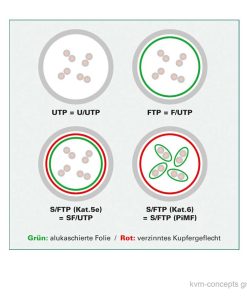 - Aufbau: Kabeltyp S/UTP (keine Paarschirmung, Gesamtabschirmung Geflechtschirm)