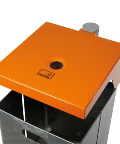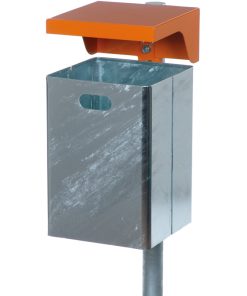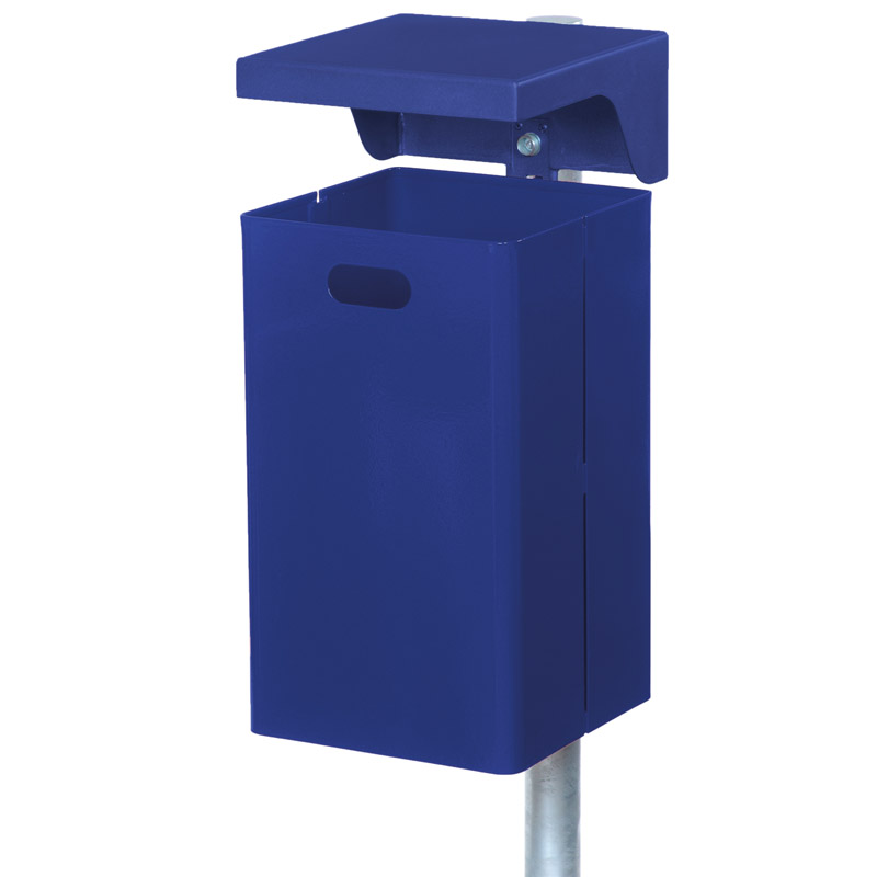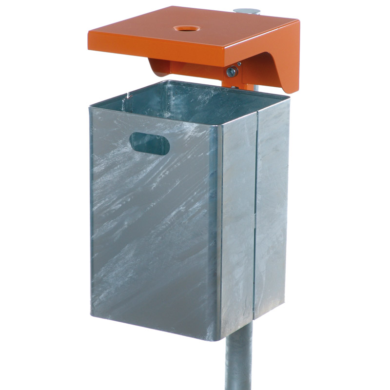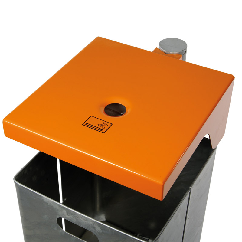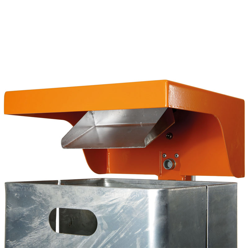 Die robuste Abdeckhaube des Abfallbehälters schützt den Inhalt und verhindert, dass allzu sperrige Abfälle in den Abfallbehälter gefüllt werden. Bei der Variante mit Ascher ist der Zigaretteneinwurf in der Haube integriert. Zum Entleeren lösen Sie den Abfallbehälter aus Stahl mit einem Dreikantschlüssel.
