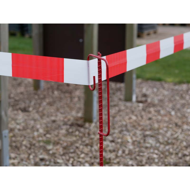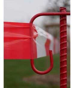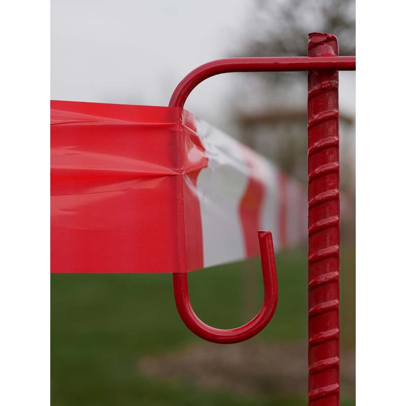 Am angeschweißten UVV-Bügel des Absperrleinenhalters aus Stahl können Sie Flatterband oder Leinen befestigen, aber auch Kabel oder benötigte Werkzeuge einhängen.