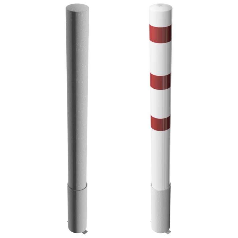 Besondere Sichtbarkeit erhalten die 2 Meter hohen, feuerverzinkten Absperrpfosten durch eine weiße Farbbeschichtung mit roten Reflexstreifen der Klasse RA1.