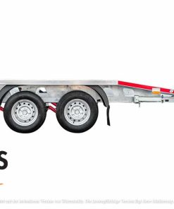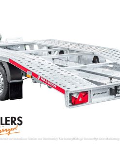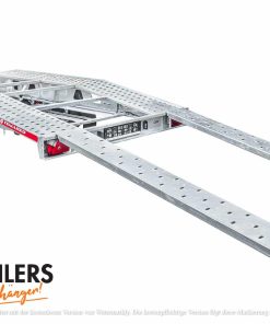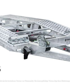 Plattform aus geschweißter Konstruktion für den Transport von kleinen Fahrzeugen wie Quads. Möglichkeit der Anbringung von Brücken auf beiden Seiten des Anhängers. Tragrahmen aus verzinkten, gebogenen und miteinander verschraubten Stahlprofilen. Rampen unter der Transportfläche versenkbar. In den Längsträgern Halterungen zur Befestigung von Transportgurten.