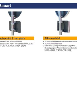Alle Bauarten bestehen aus leichtem und rostfreiem Aluminium. Unsere Straßenschilder erhalten Sie, je nach Verkehrszeichentyp, mit einer Verkehrszeichenfolie in den Reflexklassen RA 1 und RA 2 nach DIN 67520 – mit der richten Wahl der Schilderfolie sorgen Sie für eine optimale Verkehrssicherheit. Bitte beachten Sie hierzu auch unsere weiterführenden Informationen direkt neben der Variantenauswahl „VZ-Bauart“ & „VZ-Folie“ (bitte direkt auf den Info-Button klicken).