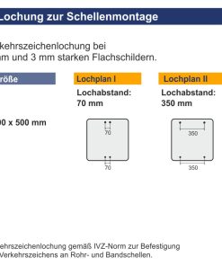Gerne Lochen wir die Verkehrsschilder der Bauarten 2 mm und 3 mm nach Lochplan I (Lochabstand 70 mm) oder Lochplan II (Lochabstand 70 – 700 mm) für die von Ihnen gewählten Schilderschellen für die Verkehrszeichenmontage am Rundrohrpfosten oder Schildermasten. Selbstverständlich können Sie die Straßenschilder auch ohne Lochung bestellen – dies ist als Standard bei der Variantenauswahl bereits hinterlegt. Bitte beachten Sie hierzu auch unsere weiterführenden Informationen direkt neben der Variantenauswahl „Lochung“ (bitte direkt auf den Info-Button klicken).