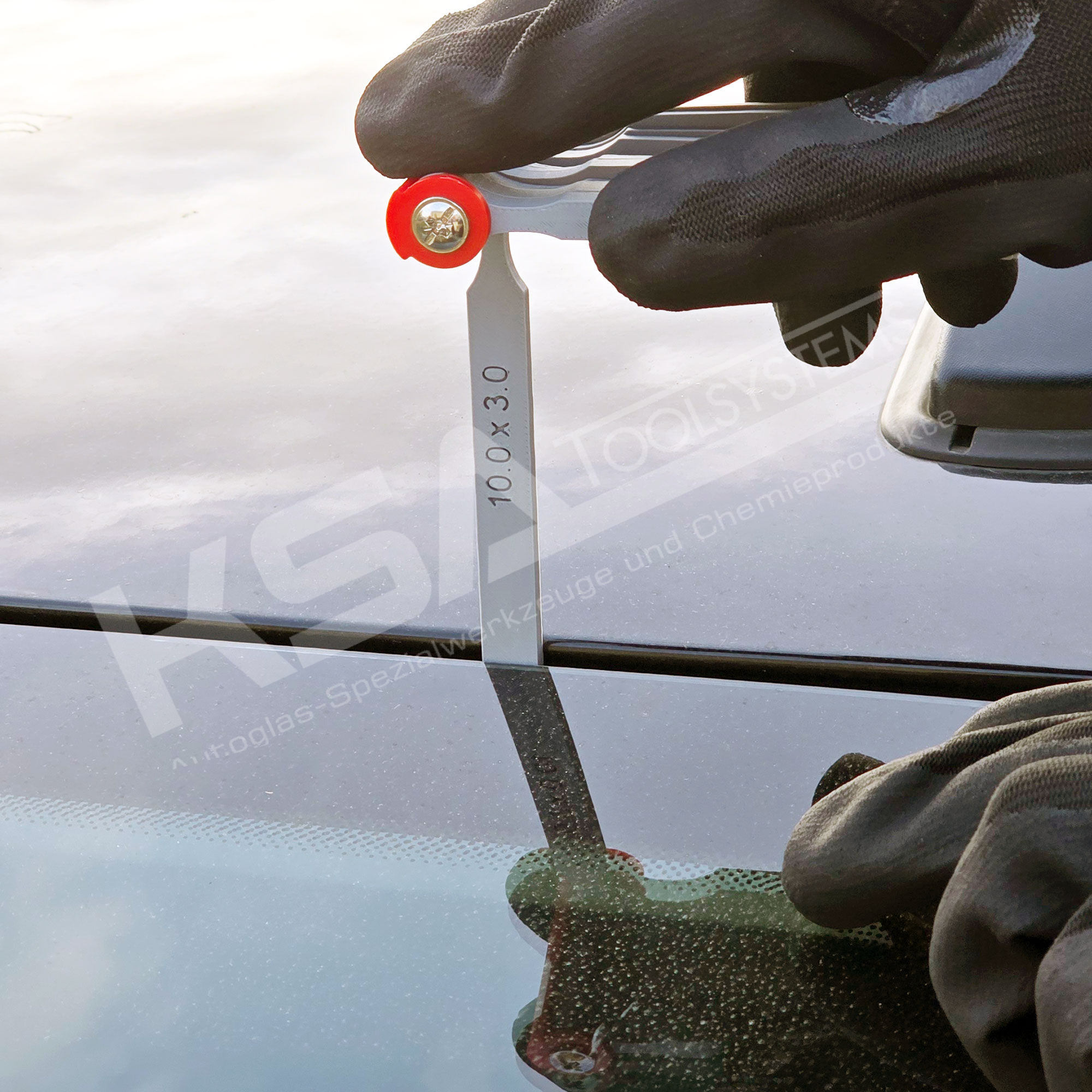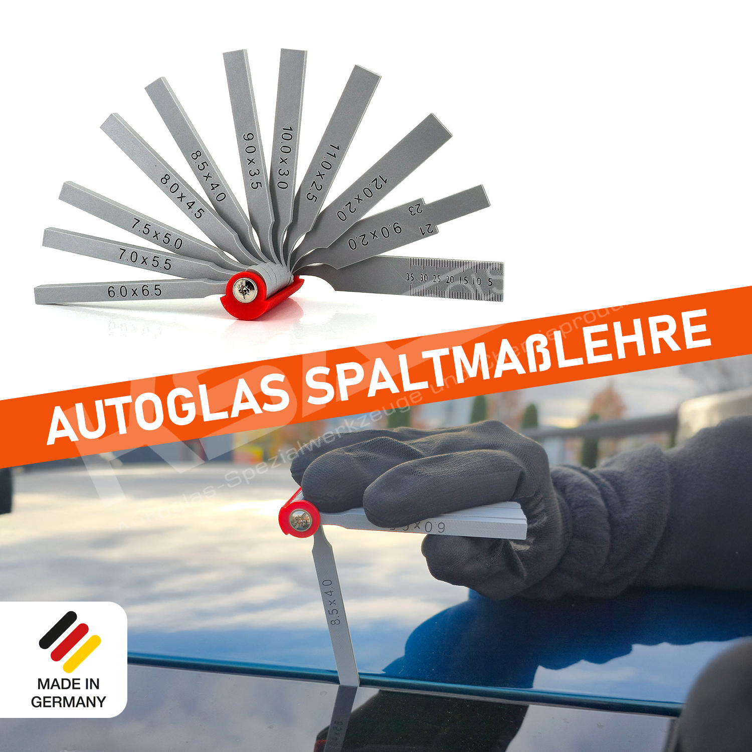 Die Spaltmaß-Fühlerlehre ist das ideale Werkzeug für Autoglaser, Werkstätten und Karosseriebetriebe, um die korrekten Spaltmaße beim Einbau von Frontscheiben schnell und zuverlässig zu ermitteln.