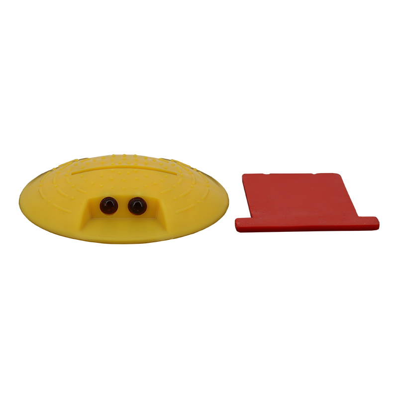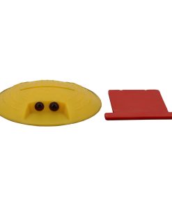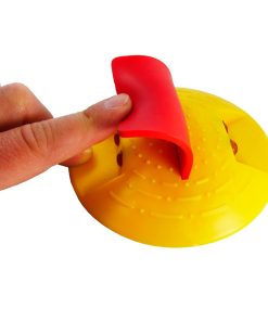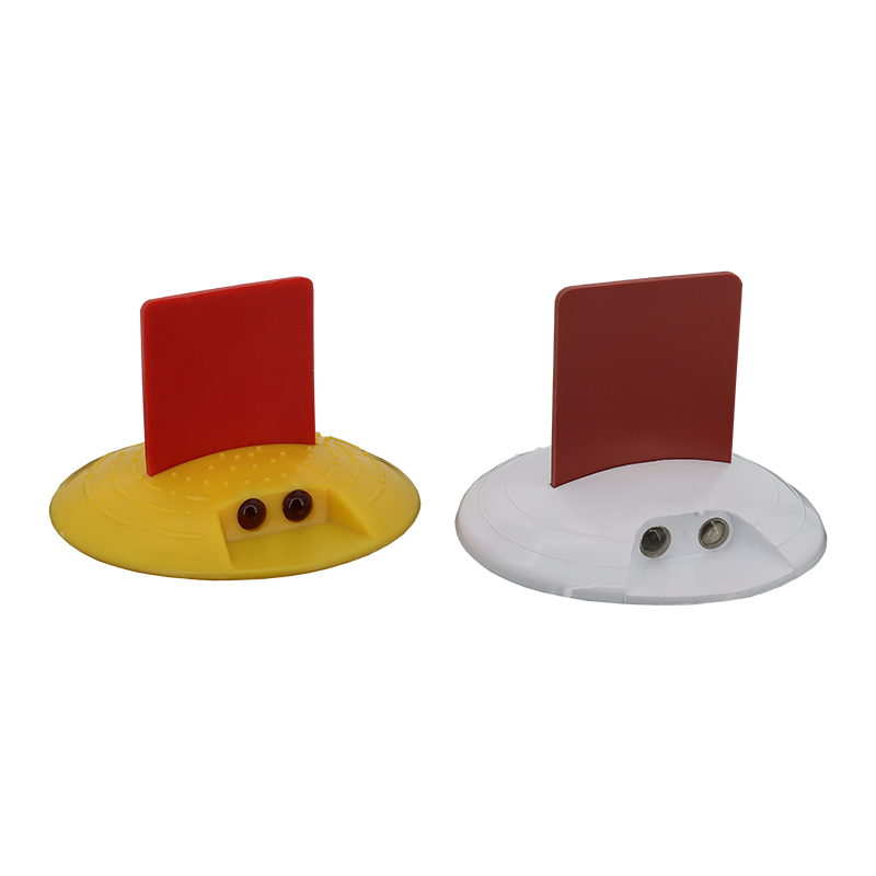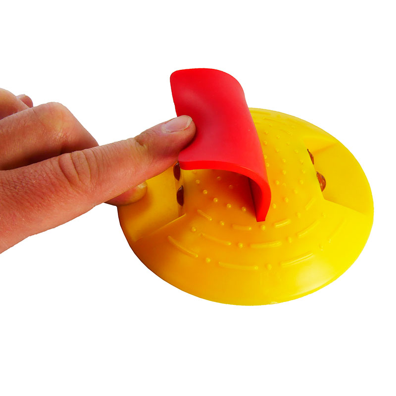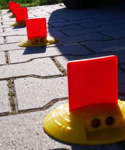 Der runde Markierungsnagel aus witterungsbeständigem Kunststoff hat einen Durchmesser von 120 mm und trägt in der Mitte eine flexible rote Gummifahne sowie beidseitig je zwei Reflektoren. Der Markierungsknopf ist in Gelb und Weiß erhältlich.