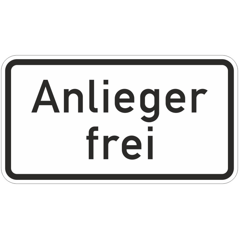 Das Verkehrszeichen 1020-30 „Anlieger frei“ ist ein rechteckiges Zusatzschild mit weißem Grund, schwarzem Rand und der Aufschrift „Anlieger frei“ in Schwarz.