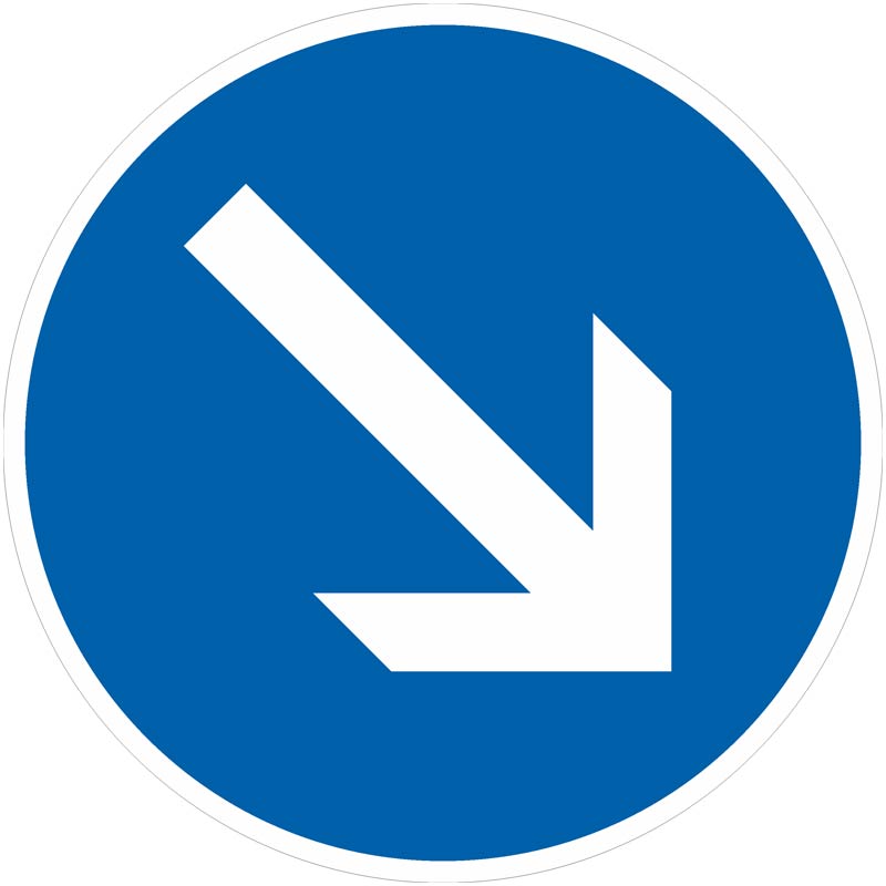 Das Verkehrszeichen 222 „Vorgeschriebene Vorbeifahrt rechts vorbei“ ist ein rundes Gebotsschild (Ronde) nach StVO. Es zeigt einen weißen Pfeil auf blauem Grund, der nach rechts unten weist.