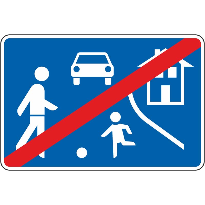 Das Verkehrszeichen 325.1-40 „Beginn und Ende eines verkehrsberuhigten Bereichs, doppelseitig (Rückseite mit Verkehrszeichen 325.2)“ ist ein rechteckiges Verkehrsschild mit zwei lesbaren Seiten. Auf der Vorderseite sind weiße Piktogramme auf blauem Grund abgebildet, die ein Fahrzeug, ein Haus mit Straße, eine Person und ein ballspielendes Kind darstellen. Auf der Rückseite ist das gleiche Sinnbild mit einem roten Balken diagonal durchgestrichen.