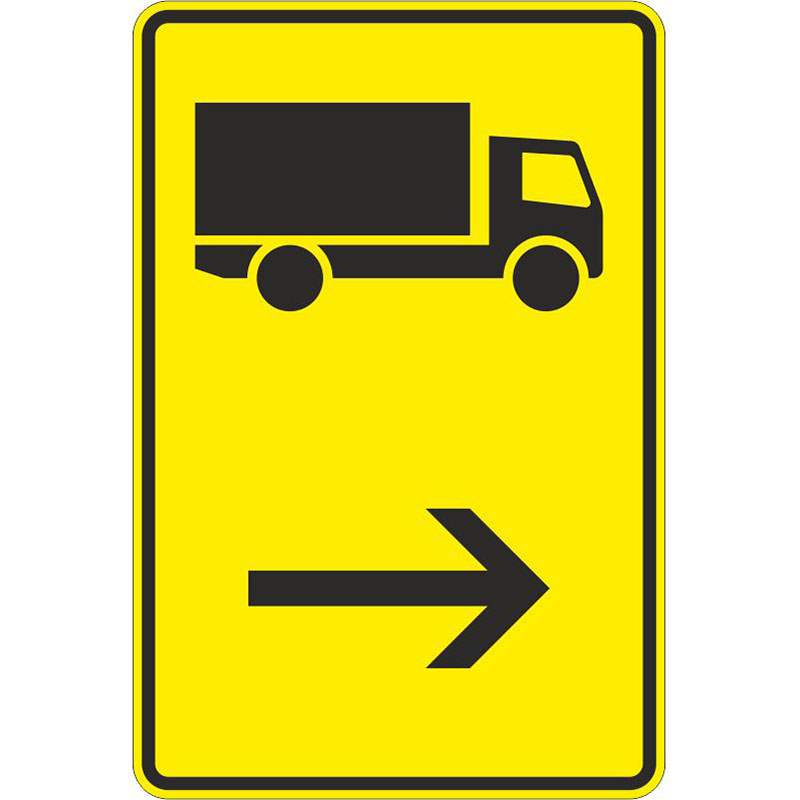 Das Verkehrszeichen 422-20 „Wegweiser für Kfz mit einer zul. Gesamtmasse über 3,5 t, hier rechts“ ist ein rechteckiges Verkehrsschild zur Hochkant-Montage mit gelbem Grund und schwarzer Beschriftung. Es zeigt oben das Sinnbild eines LKW mit Fahrtrichtung nach rechts, darunter einen rechts weisenden Pfeil.