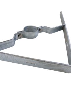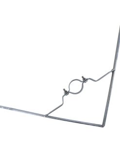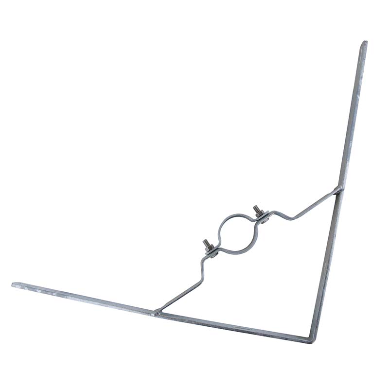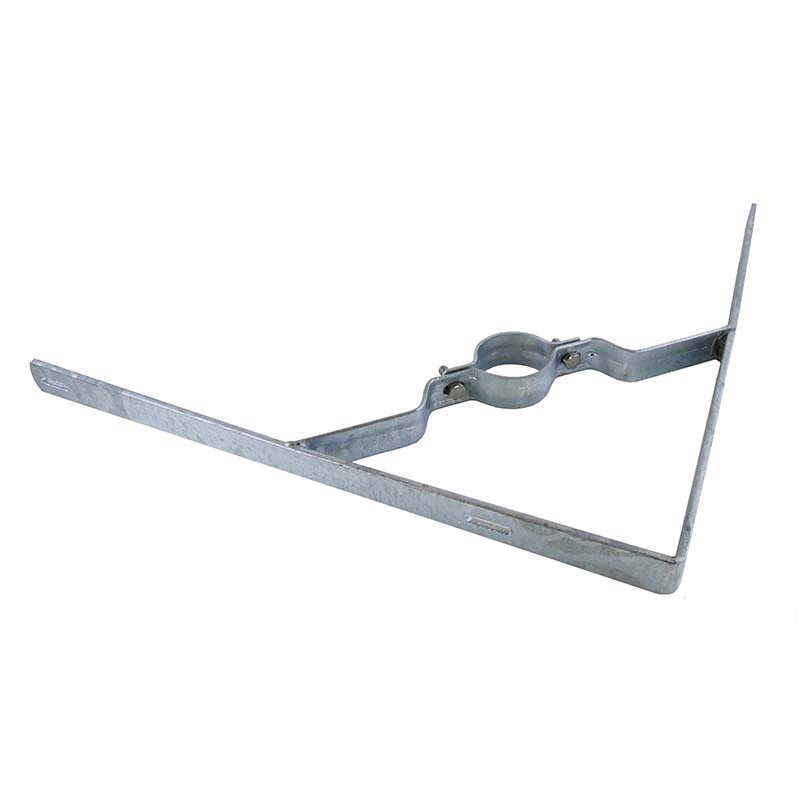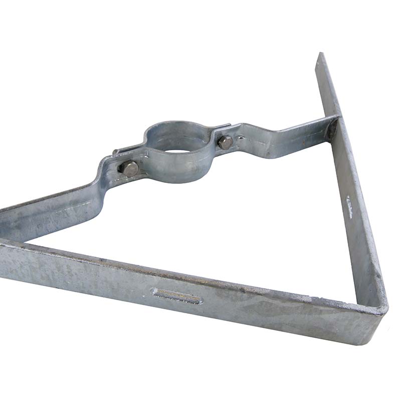 Die Halterung für den Standpfosten ist mittig zwischen den beiden Flacheisen angeschweißt. Die Flacheisen bilden eine Spitze. Bestellen Sie die Rohrschelle mit 2 Schrauben und Muttern für Ø 60 oder 76 mm.
