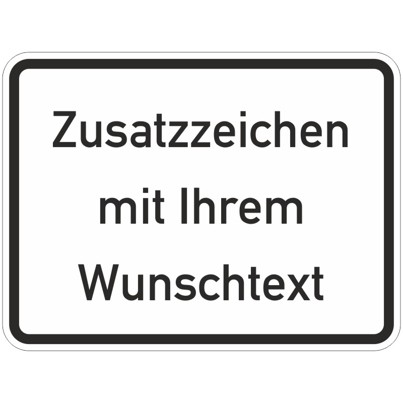 Das Zusatzzeichen mit Wunschtext, individuelle Beschriftung ist ein StVO-Zusatzzeichen mit weißem Grund und schwarzem Rand, das wir für Sie individuell bedrucken lassen. Zusatztafeln werden als Ergänzung zu den regulären Verkehrszeichen eingesetzt.